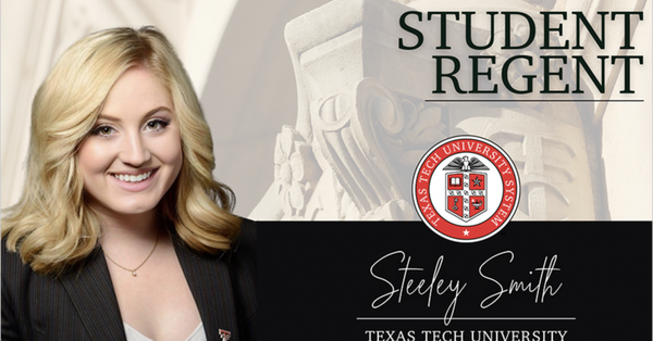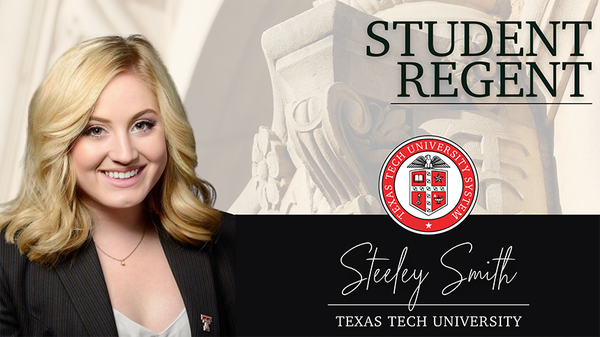 Ms. Steeley Smith of Mason, Texas, was appointed by Gov. Greg Abbott to serve the Texas Tech University System Board of Regents as the Student Regent for a one-year term, expiring May 31, 2024. She is the 18th student to serve on the board and is the sixth to represent Texas Tech University (TTU).
